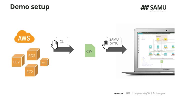 For obvious reasons, we model cloud environments as part of the enterprise architecture universe. SAMU’s API and the data synchronization module enable our clients to integrate SAMU to basically anything and exchange data. In this demo we used the sync module to create a data stream from the ever-changing Amazon Web Services and visualize it.